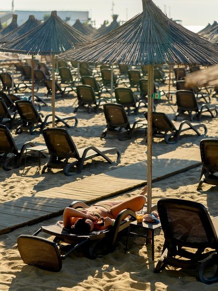 - Strand: Sand, Liegestühle, Sonnenschirme
