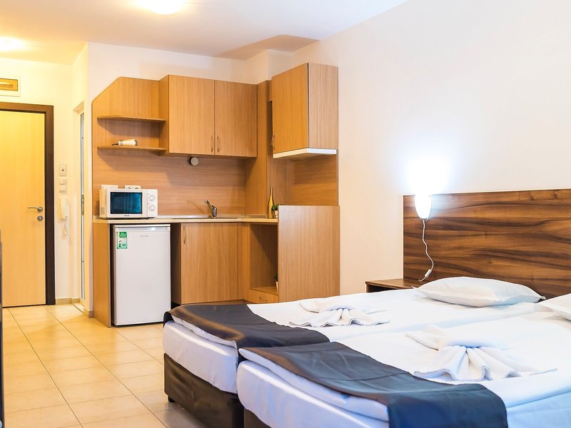 Szállás: Légkondicionáló és fűtés biztosítja a kellemes beltéri klímát. A vendégek az erkélyről vagy teraszról élvezhetik a városra néző kilátást. A szobákban egy franciaágy és egy kanapéágy található. Pótágyak kérhetők. A szobákban konyhasarok is található. Telefonnal, TV-vel és ingyenes wifivel felszereltek. A zuhanyzóval és káddal felszerelt fürdőszobában hajszárító is található. Akadálymentesített fürdőszobák is rendelkezésre állnak. Az apartmankomplexum családi és nemdohányzó szobákat kínál.