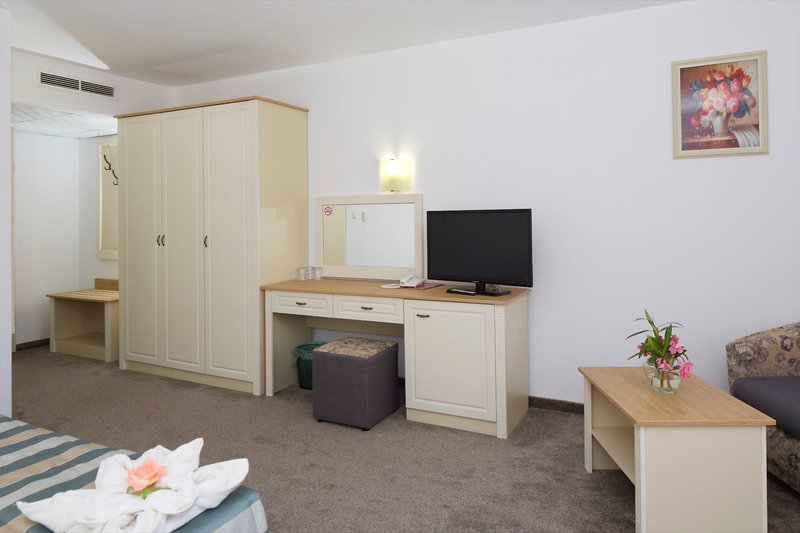 Ausstattung: Das Hotel verfügt über 215 Zimmer und Appartements, Rezeption, Lobby, Lift, Wi-Fi, ein Restaurant, ein Café und eine Bar. In der gepflegten Außenanlage befindet sich der Swimmingpool mit Liegen und Schirmen (inklusive). Am Strand stehen den Gästen Liegen und Schirme gegen Gebühr zu Verfügung (lokale Anbieter). Für die kleinen Gäste gibt es einen Indoorpool mit Rutschen.