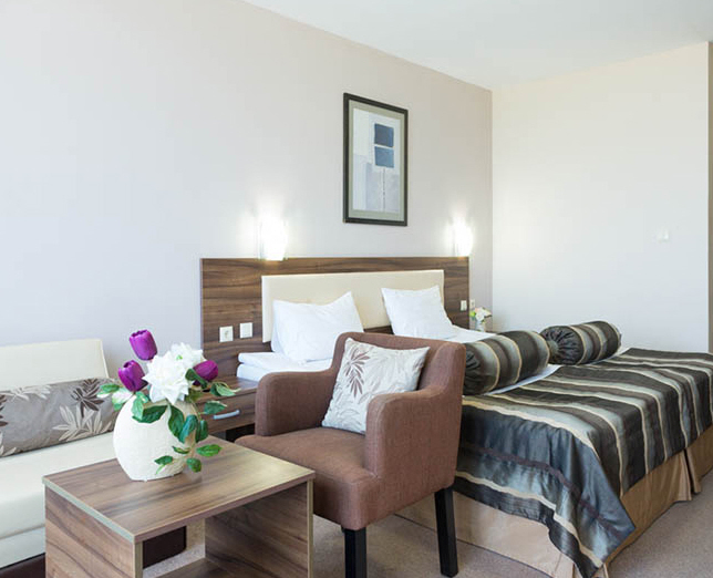 modern és kényelmesen berendezett standard szobák felszereltsége: kád/WC, hajszárító, légkondicionáló, telefon, műholdas LCD TV, WiFi (ingyenes), minibár (térítés ellenében) és erkély. Alternatív megoldásként ezek egyszeri használatra is lefoglalhatók.