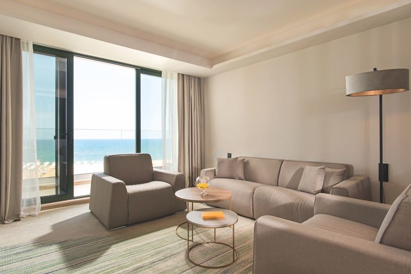 Suite (BOJB02, ab Sommer 2026): Die großzügige und modern eingerichtete Suite mit Parkblick besteht aus einem Schlafzimmer mit Kingsize-Bett und einem separaten Wohnbereich mit Doppelschlafsofa sowie Badezimmer mit Dusche/WC. Außerdem gibt es Wasserkocher, Minibar (kostenlos), Balkon, Internet, Safe, Kapsel-Kaffeemaschine (kostenlos) und Sat.-TV mit lokalen Sendern sowie zentral gesteuerter Klimaanlage (ca. 80m², S2). Wahlweise mit Meerblick buchbar (S2M).