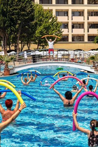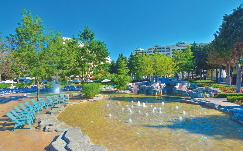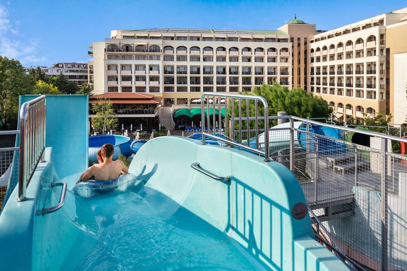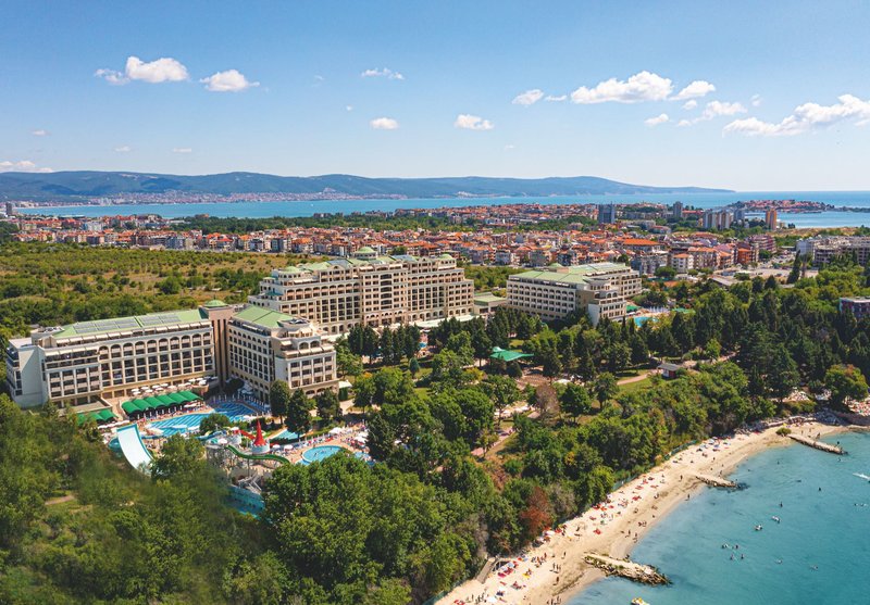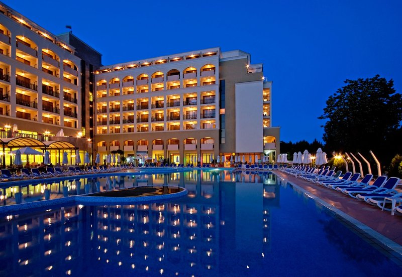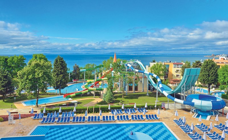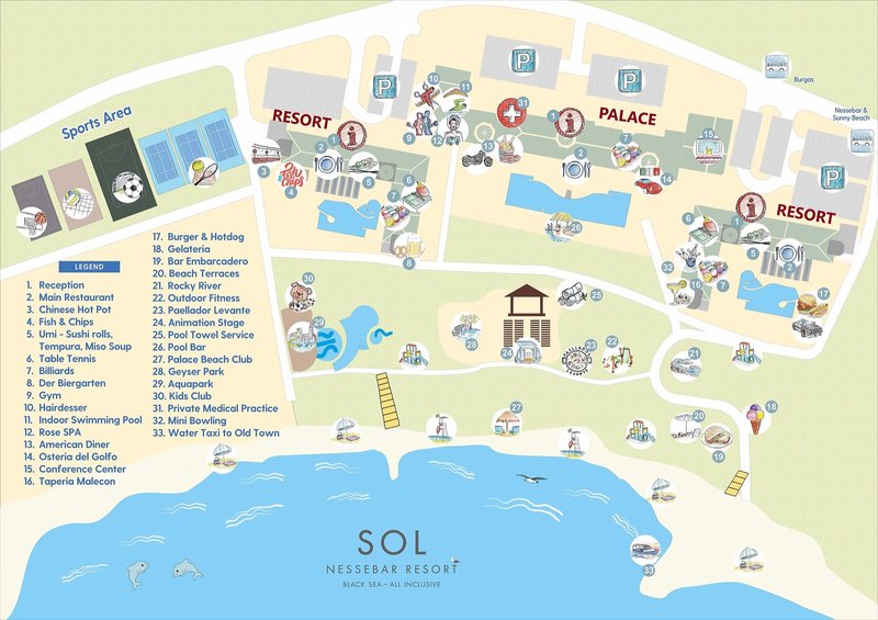 Ausstattung: Das familienfreundliche Resort verfügt über insgesamt 990 Zimmer und Suiten, verteilt auf 3 Gebäude (Palace und Resort). Jedes Hotel verfügt über ein eigenes Hauptrestaurants, eine Lobbybar, einen Pool mit einer Sonnenterasse, eine Poolbar und eine eigene Rezeption (die Hoteleigenen Einrichtungen können nur von den Hotelgästen des jeweiligen Hotels benutzt werden). Verschiedene Themen-Restaurants und Bars verteilt im gesamten Resort wie z. B. den Biergarten mit traditionellen deutschen Köstlichkeiten wie Bratkartoffeln und Sauerkraut oder auch traditionelle italienische, spanische und japanische Küche, stehen allen Gästen des Resorts zur Verfügung genauso wie der Geldwechselschalter, der Friseur (gegen Gebühr), der Mini- Supermarkt, das Spa Relax-Center "Rose" (gegen Gebühr), das Hallenbad (im Sol Nessebar Palace), die Sonnenterrasse (Strandnah gelegen), der Aquapark (von ca. Mitte Mai-Ende September Stundenweise und wetterabhängig geöffnet) mit Rocky River Rutsche und die Kinderbecken und Wasserrutschen auch für die Kleinsten (Geyzir Park für Kinder von 2-5 Jahre). Der Eintritt in den Aqua Park ist für alle Gäste des Resorts inklusive. Liegen und Schirme sind am Pool des jeweils gebuchten Hotels sowie am Aqua Park, am Geyzir Park und auf den Sonnenterrassen oberhalb des Strandes mit herrlichem Meerblick inklusive. Bei Buchung der Zimmer im Hotelkomplex Sol Nessebar Bay & Mare erfolgt die Zimmereinteilung durch den Hotelier vor Ort, es ist NICHT möglich im Vorfeld anzufragen, in welchem Gebäude die Unterbringung erfolgen wird.