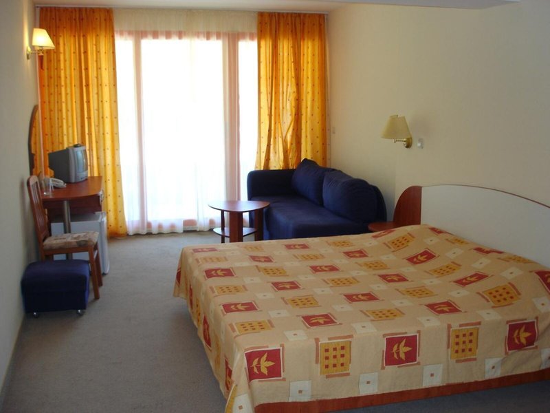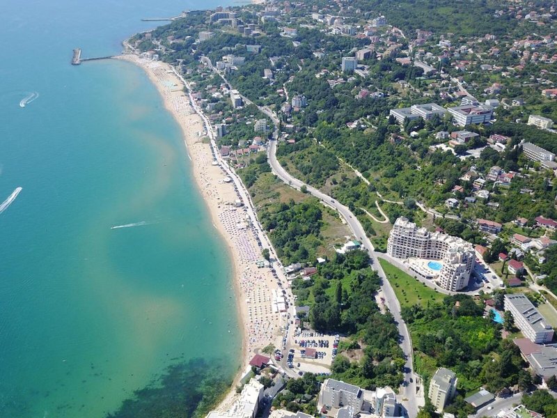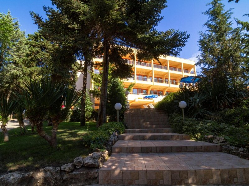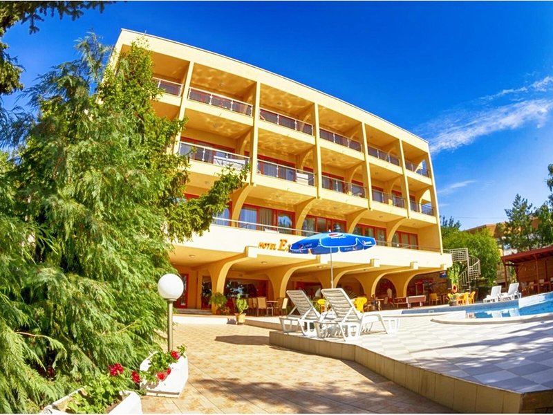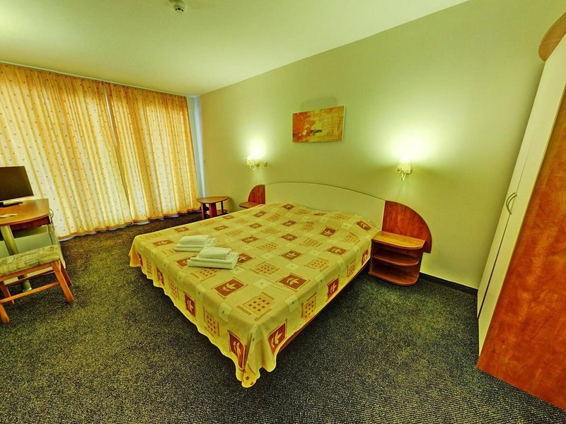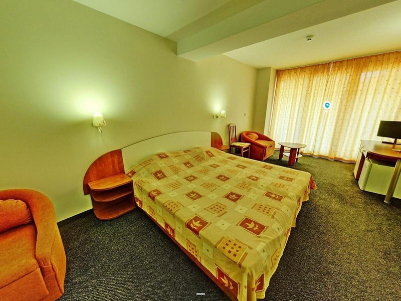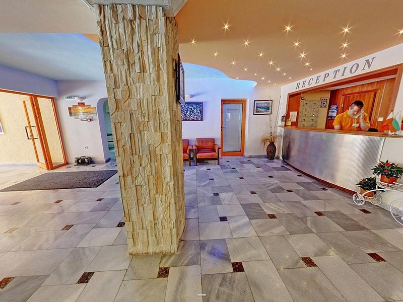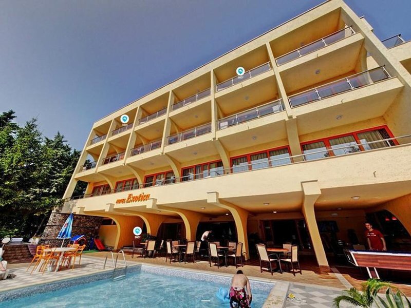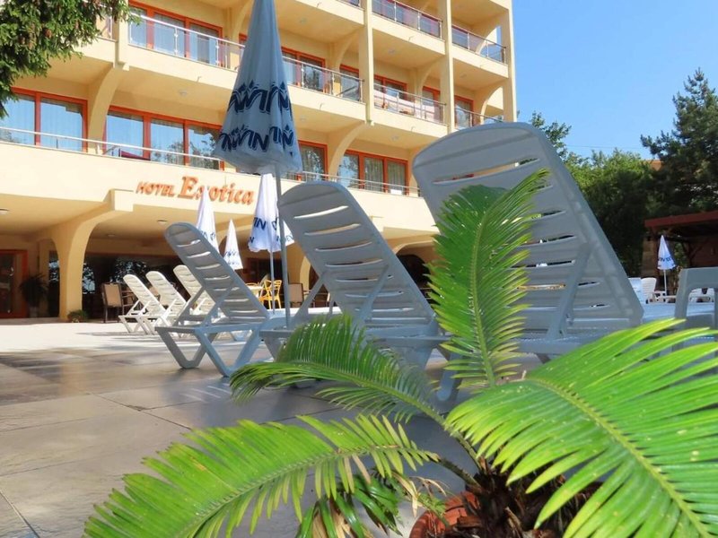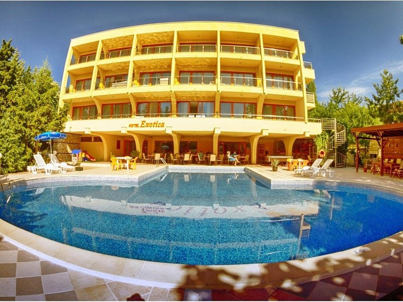 Lage & Umgebung Das Hotel befindet sich in malerischer Hanglage, am Ortsrand des Seebads Goldstrand. Der Strandabschnitt ist bereits nach wenigen Metern zu erreichen. Zum etwa 1,5 Kilometer entfernten Zentrum der Ortschaft verkehrt ein Shuttlebus. Zahlreiche Boutiquen, Bars und Restaurants sind auch in der unmittelbaren Nähe des Hotelgebäudes vorzufinden. Die Stadt Albena ist ca. 7 Kilometer und die Stadt Varna ungefähr 18 Kilometer vom Hotel entfernt.