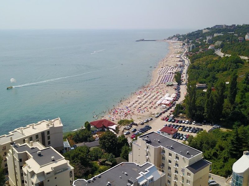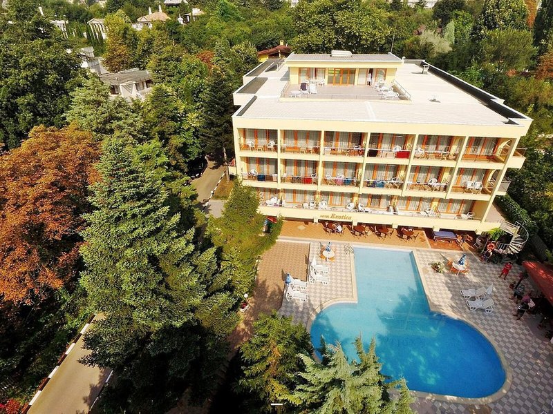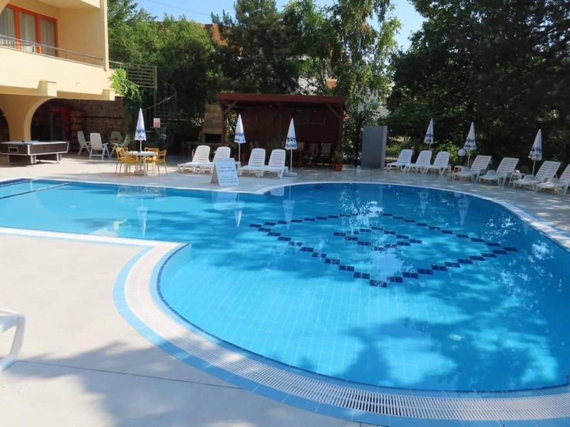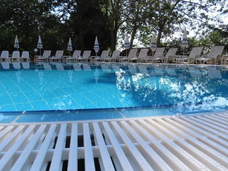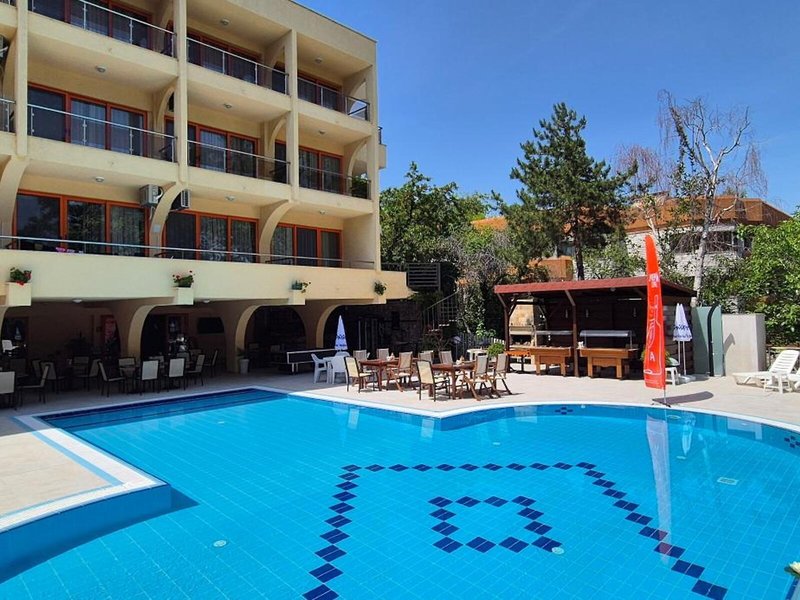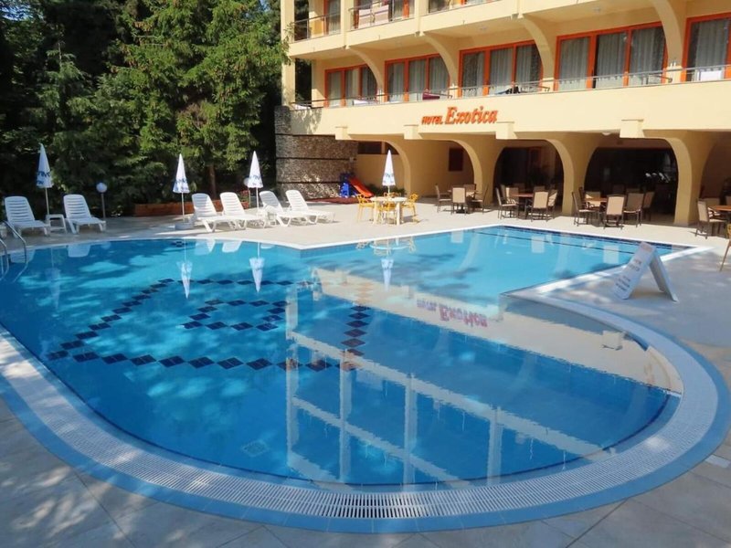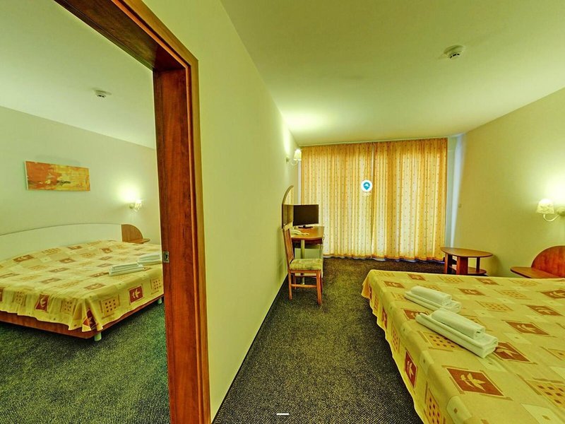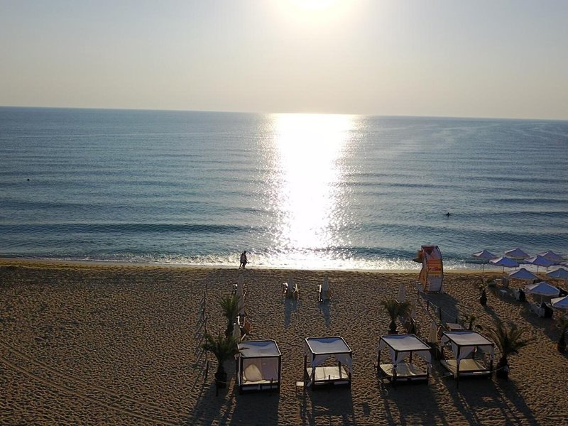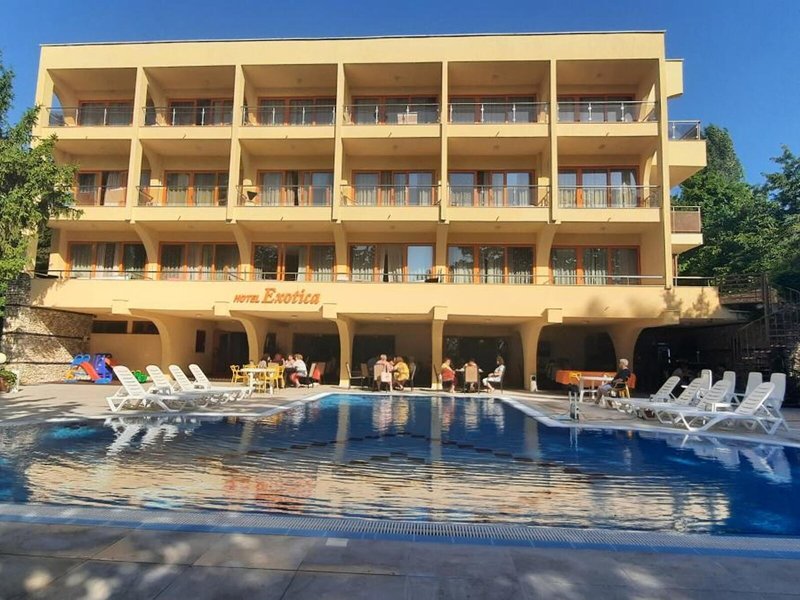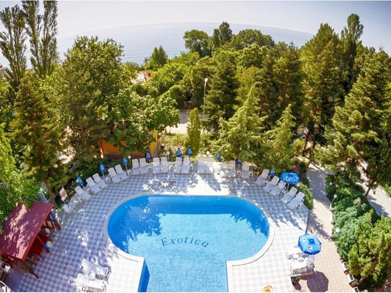 Lage & Umgebung Das Hotel befindet sich in malerischer Hanglage, am Ortsrand des Seebads Goldstrand. Der Strandabschnitt ist bereits nach wenigen Metern zu erreichen. Zum etwa 1,5 Kilometer entfernten Zentrum der Ortschaft verkehrt ein Shuttlebus. Zahlreiche Boutiquen, Bars und Restaurants sind auch in der unmittelbaren Nähe des Hotelgebäudes vorzufinden. Die Stadt Albena ist ca. 7 Kilometer und die Stadt Varna ungefähr 18 Kilometer vom Hotel entfernt.
