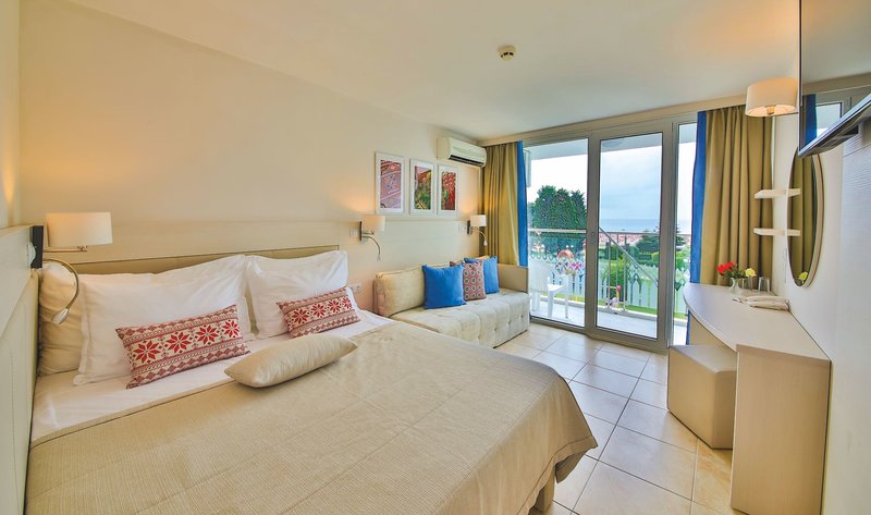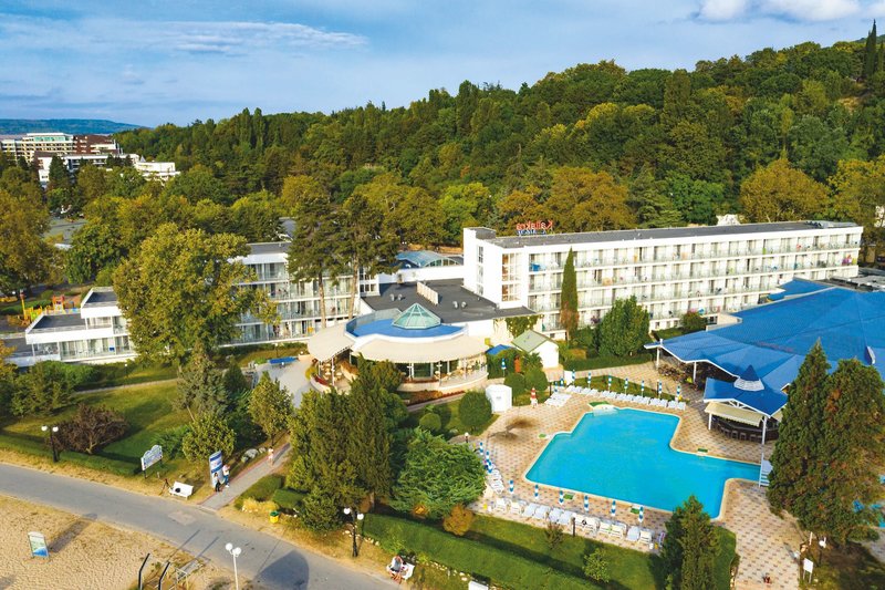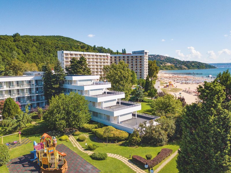 Ausstattung: Das modern gestaltete Ferienhotel, welches bei vielen Stammgästen beliebt ist, überzeugt durch die direkte Lage am traumhaften, langen und breiten Sandstrand von Albena. Das Hotel verfügt über 148 Zimmer auf 3 bzw. 4 Etagen, eine Empfangshalle mit Rezeption, Lift, Lobby-Bar und Leseecke. Ein Hauptrestaurant (Buffetform) mit einer Außenterrasse begeistert mit internationaler, mediterraner und landestypischer Küche. Im Außenbereich befindet sich die weitläufige Gartenanlage mit dem zum Meer hin angelegten Süßwasserswimmingpool, der Sonnenterrasse und der Poolbar mit einer Sitzterrasse. Liegen und Sonnenschirme sind am Pool inklusive (je nach Verfügbarkeit) und Auflagen gegen Gebühr. Am Hoteleigenen Strandabschnitt sind pro Zimmer zwei Liegen und ein Sonnenschirm inklusive (ab der 3. Reihe, nach Verfügbarkeit und im Zeitraum vom ca. 24.5.-30.9.). Liegen und Sonnenschirme in der 1. und 2. Strandreihe sind gegen Gebühr sowie die Badetücher für Pool und Strand. Wi-Fi in allen öffentlichen Bereichen inklusive.