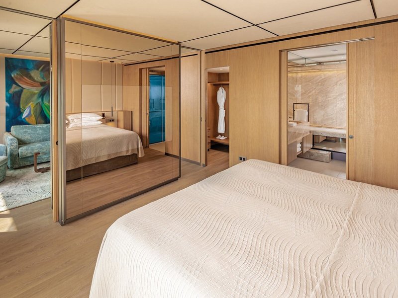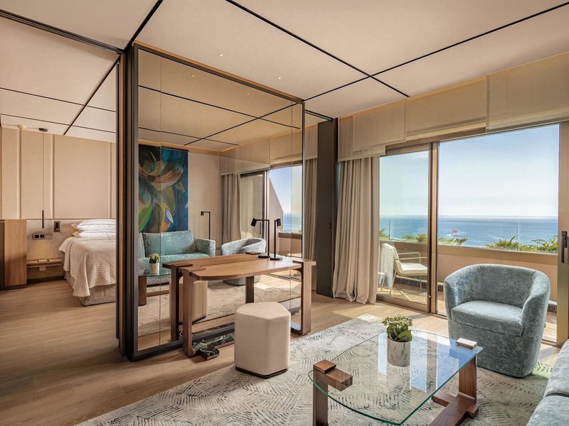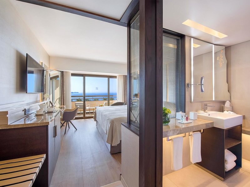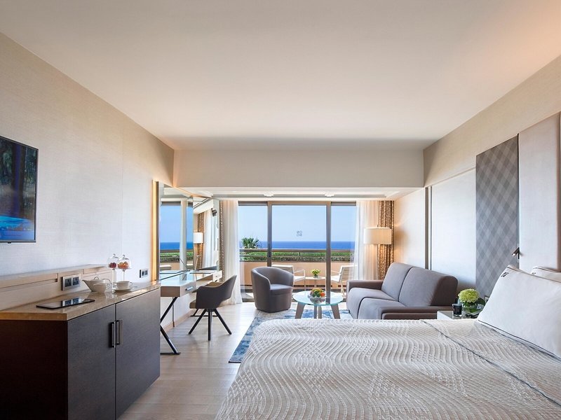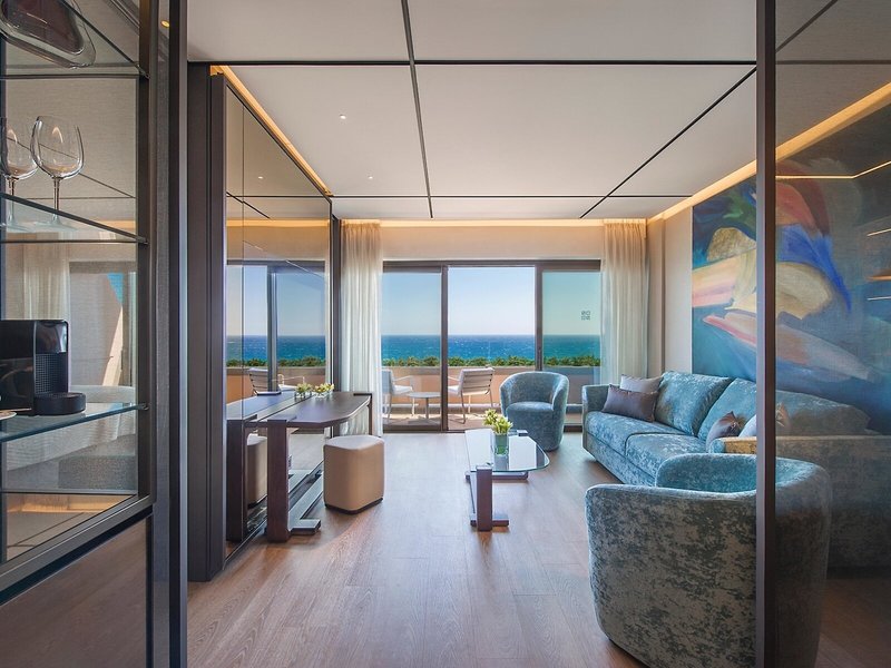 - Signature Suite (SUM2), Suite, Nichtraucherzimmer, im Hauptgebäude, Meerblick, ca. 56 m², letzte Komplettrenovierung 2023, Gesamtanzahl der Räume in diesem Zimmertyp: 2, Aufteilung wie folgt: bestehend aus 2 Zimmern, optisch getrennt durch Schiebetür, Klimaanlage: individuell regelbar, Heizung: November - April; wetterabhängig, individuell regelbar, Fußboden: Laminat, Safe: ohne Gebühr, Sofa, Schreibtisch, Nespressomaschine, Kaffee-/Teezubereiter, Wasserkocher, Minibar: gegen Gebühr, Softdrinks: gegen Gebühr, Wasser: gegen Gebühr, alkoholische Getränke: gegen Gebühr, Snacks: gegen Gebühr, Minibarauffüllung: täglich, Telefon, Internet: WLAN/WiFi: ohne Gebühr, Fernseher: Flatscreen, im Wohnbereich, im Schlafzimmer, deutsches Programm, Sat-TV, Roomservice: täglich 24 Stunden, gegen Gebühr, Reinigungsservice: täglich, ohne Gebühr, Dusche, Badewanne, WC, Bademantel: ohne Gebühr, Slipper: ohne Gebühr, Föhn, Balkon: mit Sitzgelegenheit