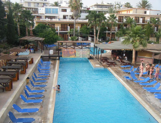 Die bei jungen, partyfreudigen Leuten beliebte Anlage besteht aus 5 Gebäuden mit insgesamt 194 Studios und Appartements. Zur Ausstattung gehören eine Empfangshalle mit Rezeption, WLAN/Internetecke (gegen Gebühr), Hotelsafe (gegen Gebühr), TV-Raum, Diskothek, Konferenzräume, Wäscheservice (gegen Gebühr), kostenfreie Parkmöglichkeiten, verschiedene Geschäfte und ein Minimarkt. Im Außenbereich finden Sie saisonal 2 Swimmingpools mit Sonnenterrasse. Liegen und Badetücher stehen Ihnen an den Pools kostenfrei zur Verfügung.