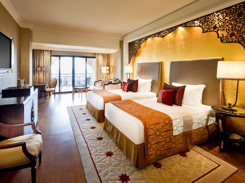 - Two Bedroom Suite (SUX2), im Hauptgebäude, Meerseite, Meerblick, Poolblick, Blick auf Palm Jumeirah, ca. 142 - 142 m², Gesamtanzahl der Räume in diesem Zimmertyp: 2, Aufteilung wie folgt: bestehend aus 2 Zimmern, optisch getrennt durch Schiebetür, Wohnzimmer, 2 Schlafzimmer, 2 Queen Size Betten (140x200cm), 1 King Size Bett (200x200cm), 1 Zustellbett (120x200cm), Babybett, Klimaanlage: individuell regelbar, zentral gesteuert, Fußboden: Parkett, Safe, Sofa, Schreibtisch, Bügeleisen, Bügelbrett, Kaffeemaschine, Kaffee-/Teezubereiter, Wasserkocher, Minibar: gegen Gebühr, Minibarauffüllung, Telefon, Fernseher: Flatscreen, Sat-TV, iPod-Docking Station, Roomservice: gegen Gebühr, Reinigungsservice, Dusche, separate Dusche, Regendusche, Badewanne, WC, Bademantel, Slipper, 2 Bäder, Föhn, Balkon: mit Sitzgelegenheit