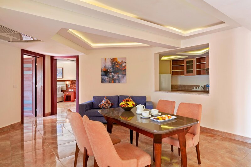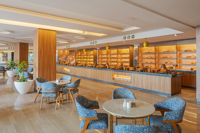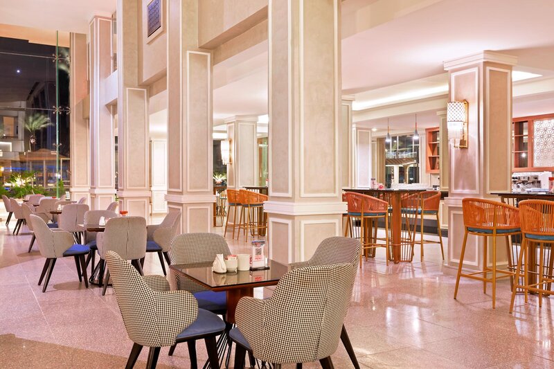 Die beliebte Ferienanlage ist großzügig gestaltet und besteht aus einem Haupthaus, Bungaloweinheiten (bis 350 m) und einem Nebengebäude (ca. 450 m), auf die sich die insgesamt 678 Zimmer verteilen. Zu den weiteren Ausstattungen gehören die elegant eingerichtete Empfangshalle mit Rezeption und freies WLAN, eine Lobby Bar, 4 Themenrestaurants (asiatische, internationale, orientalische und italienische Küche), ein À-la-carte-Restaurant, Geschäfte und ein Schönheitssalon mit Friseur.