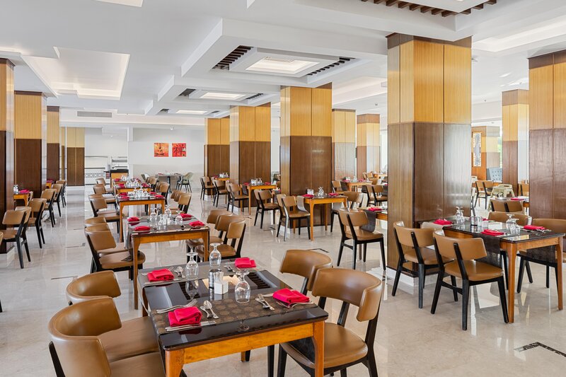 All Inclusive: Reggeli, ebéd és vacsora büférendszerrel, fagylalt 10:00 és 22:00 óra között, valamint harapnivalók a strandbárban egész nap. Helyi alkoholmentes italok 10:00 és éjfél között. A lobbibárban a nap 24 órájában alkoholmentes italok kaphatók. A helyi alkoholos italok 10:00 és éjfél között benne vannak az árban; ezeken az időpontokon kívül felár fizetendő.