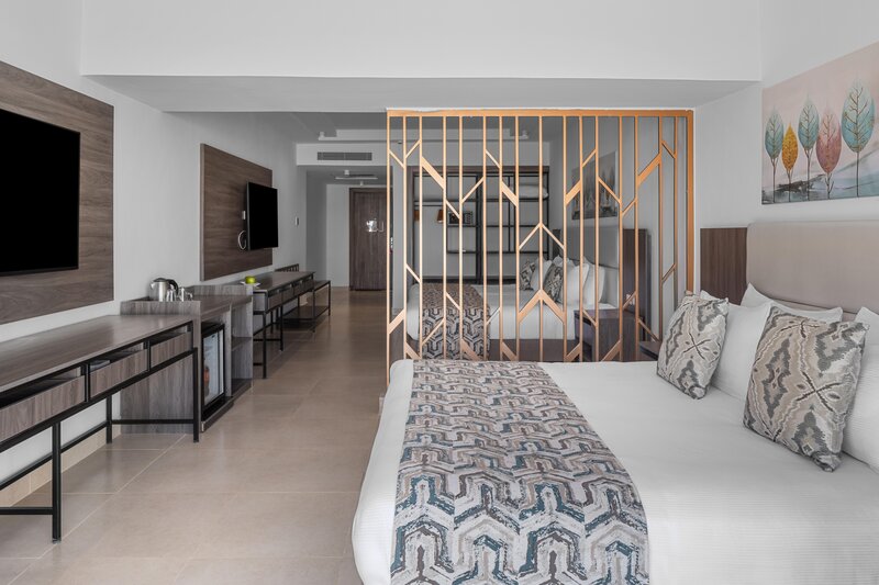 Komfortabel und modern mit Balkon/Terrasse, Klimaanlage, Dusche/WC, WLAN, SAT-TV, Safe, Minibar. Wahlweise mit Pool- (DXP, EXP, TPX) oder Meerblick (DXM, EXM, TXM). Familienzimmer (FPX, TPX) sind geräumiger und bieten mehr Platz.Die Splash Aquapark Zimmer (SPL, SQL, STL) ca. 106 qm verfügen über 2 Schlafzimmer, Klimaanlage, Minibar (inkl. Wasser), Kaffee- und Tee Zubereiter, WLAN, TV, Safe. 2 Badezimmer, Dusche, WC, Föhn. Balkon mit Wasserparkblick.