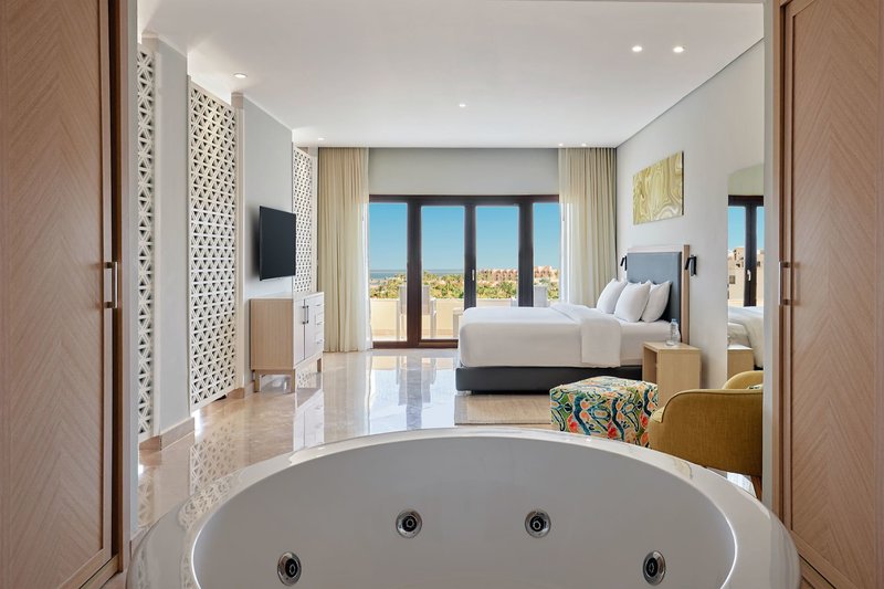 Elite Suite: Die Elite Suiten (EL2, ELA) verfügen über die gleiche Ausstattung wie die Superior Suiten, verfügen aber zusätzlich über folgende Leistungen: Persönlicher Check-in/out, sowie Late Check-out bis 16 Uhr (nach Verfügbarkeit), tägliche kostenlose Auffüllung der Minibar mit lokalen Softdrinks, freier Eintritt in den Spa-Bereich (Reservierung erforderlich), begrenztes Wi-Fi (2 Geräte pro Zimmer). Die Zimmer liegen in Richtung Golfplatz und haben Meerblick.