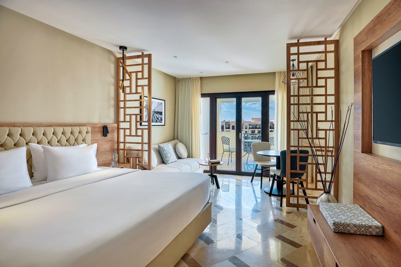 Deluxe Suite: Die Deluxe Suiten (SDM) sind ca. 142 m² groß und verfügen über ein Schlafzimmer und einem separaten Wohnbereich. Zusätzlich verfügen die Deluxe Suiten über einen Ankleidebereich und zwei Balkone mit jeweils einem Tisch und zwei Stühlen von dem aus Sie einen wunderschönen Blick über das rote Meer haben.