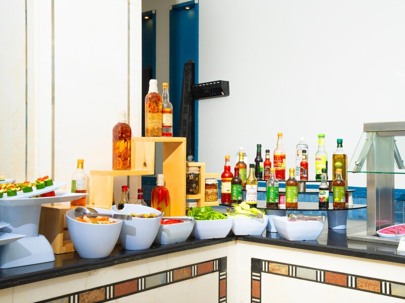 Reggeli, ebéd és vacsora svédasztalos formában, heti 1 alkalommal vacsora a 2 à la carte étterem egyikében (Layali Beirut és Royal Wok) foglalással. Késői reggeli, napközben harapnivalók, délután kávé/tea, sütemények és péksütemények. Helyi alkoholos és alkoholmentes italok 10:00 és 23:00 óra között a nyitott bárban A minibárban fejenként egy kis üveg víz biztosított minden nap. Használható a Stella di Mare Beach Resort testvérszálloda strandja, strandbárja és tengerparti étterme.