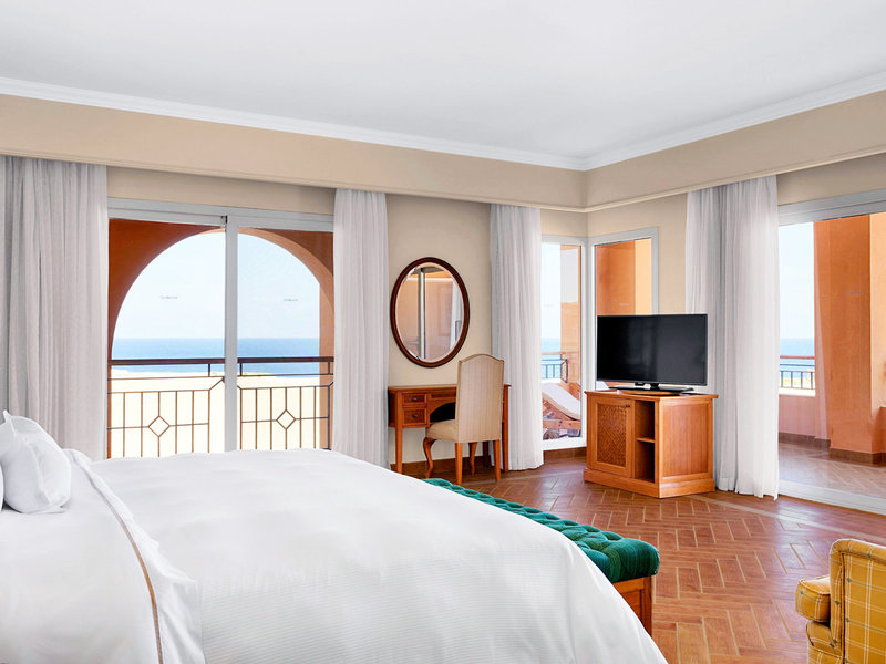 - Garry Player Suite (SUX1), Suite, im Hauptgebäude, Meerblick, Poolblick, Blick auf Golf Platz, ca. 120 m², letzte Komplettrenovierung 2018, Gesamtanzahl der Räume in diesem Zimmertyp: 2, Aufteilung wie folgt: Wohnzimmer, 1 Schlafzimmer, 1 King Size Bett, 1 Kinderbett, Babybett: ohne Gebühr, Moskitonetz, Klimaanlage: ohne Gebühr, individuell regelbar, kalt, warm, Fußboden: Fliesenboden, Safe: ohne Gebühr, Sofa, Schreibtisch, Bügelbrett, Kochnische, Kaffeemaschine, Espressomaschine, Wasserkocher, Minibar: gegen Gebühr, bei All Inclusive inklusive, Telefon, Internet: WLAN/WiFi: ohne Gebühr, Fernseher: Flatscreen, Sat-TV, Radio, Roomservice: gegen Gebühr, Dusche, Badewanne, WC, Bademantel: ohne Gebühr, Slipper: ohne Gebühr, Föhn, Kosmetikspiegel, Balkon oder Terrasse: mit Liegestühlen