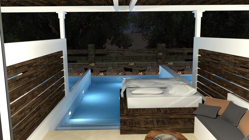 Junior lakosztályok azonos felszereltséggel, külön hálószoba nélkül, saját medencével.