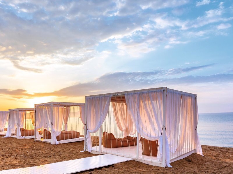 - Strand „Kalives Beach“: Sand, öffentlich mit eigenem Hotelabschnitt, Balinesische Betten: gegen Gebühr, Liegen: ohne Gebühr, Sonnenschirme: ohne Gebühr