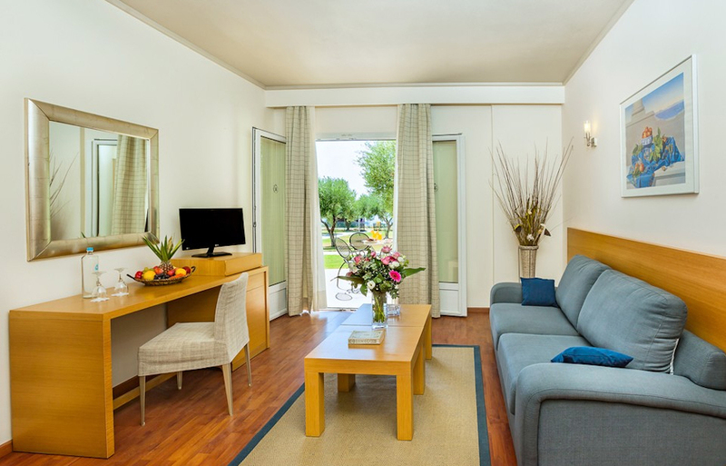 Die modern ausgestatteten Standard-Zimmer verfügen über Bad oder Dusche/WC, Föhn, Klimaanlage, WLAN, Telefon, Sat.-LCD TV, Minibar, Safe und Balkon oder Terrasse. Diese sind wahlweise auch mit Meerblick buchbar. Die geräumigeren Juniorsuiten befinden sich im Erdgeschoss und verfügen bei sonst gleicher Ausstattung über einen kombinierten Schlaf-/Wohnbereich. Die DeLuxe-Suiten sind mit 2 separaten Räumen ausgestattet.