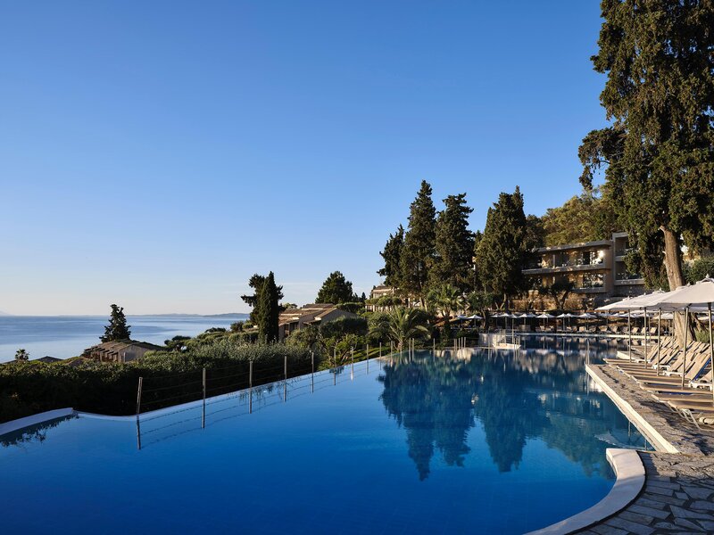 Die terassenförmig in den Hang gebaute Anlage liegt an der Ostküste der Insel und ist nur durch die Küstenstrasse vom Sand-/Kieselstrand getrennt. Zum nächsten Ort Benitses sind es ca. 3 km. Der Flughafen ist ca. 8 km entfernt.