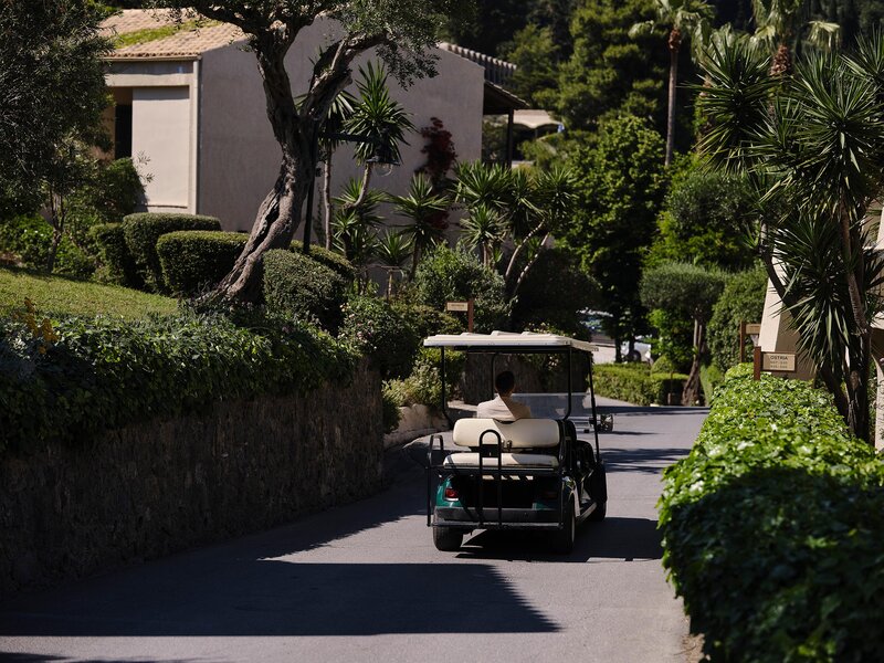 A domboldalba épített teraszos komplexum a sziget keleti partján található, és csak a parti út választja el a homokos/kavicsos strandtól. A következő város, Benitses körülbelül 3 km-re található. A repülőtér körülbelül 8 km-re található.
