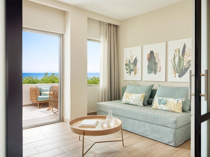 Die Doppelzimmer verfügen über Badezimmer mit Badewanne oder Dusche/WC, Föhn, Klimaanlage, Telefon, Sat.-TV, WLAN (kostenfrei), Kaffee/Teekocher, Kühlschrank, Mietsafe sowie Balkon oder Terrasse mit Tisch und Stühlen. Diese sind auch mit Meer-oder Gartenblick buchbar. Wahlweise sind diese zur Alleinnutzung buchbar. Die Familienzimmer verfügen über die gleichen Annehmlichkeiten wie die Doppelzimmer sowie größer und mit einem Wohnzimmer. Die Suiten sind größer als die Familienzimmer und bieten ein eigenes Bad und die gleichen Annehmlichkeiten.
