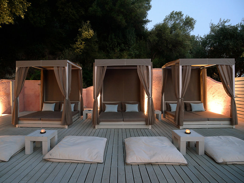 - Strand „IPSOS“: Sand, Kies, flach abfallend, öffentlich, Liegen: gegen Gebühr, Sonnenschirme: gegen Gebühr