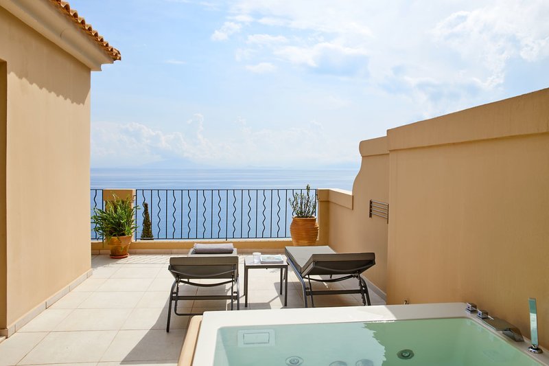 Junior lakosztály tengerre néző kilátással és pezsgőfürdővel: Ezek a lakosztályok ugyanazokat a felszereltségeket kínálják, mint a Junior lakosztály tengerre néző kilátással, plusz egy nagy teraszt napozóágyakkal és fűtött pezsgőfürdővel (JJ2/JMI).