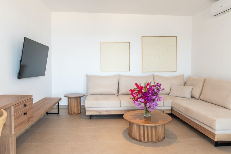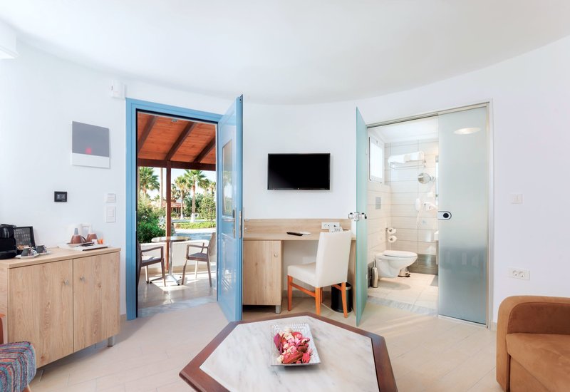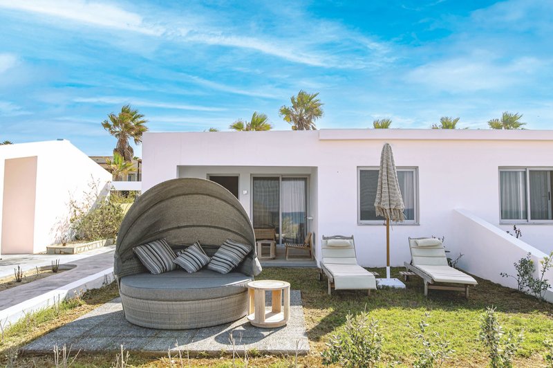 Suite Seafront: Die Suiten Seafront wurden für den Sommer 2024 frisch renoviert und verfügen über Bad mit Dusche/WC, Föhn, Telefon, Safe, individuell regulierbare Klimaanlage, Kühlschrank, Sat.-TV und Terrasse mit kleinem privaten Garten und bequemen Sonnenliegen. Zusätzlich verfügen sie über einen getrennten Schlafraum mit Verbindungstür und bei erster Reihe zum Meer über einen fantastischen Meerblick (DKM, CM). Wahlweise auch zur Alleinbenutzung buchbar (EKM).