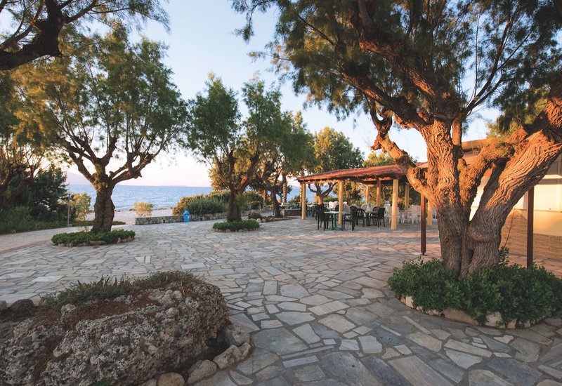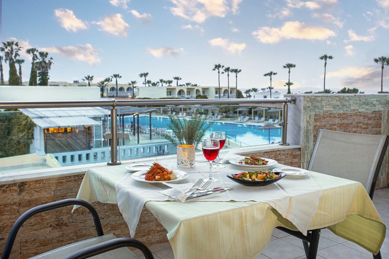 All Inclusive: Büféreggeli (7-10 óra között), ebéd (12:30-14:30) és vacsora (18:30-21:30). 18:30-19:00 óra között a belépés ingyenes gyermekes családok számára. A vacsorát a tematikus étteremben szolgálják fel (18:30-21:30 - foglalás szükséges). Harapnivalók, fagylalt és sütemények kaphatók 11:00 és 18:00 óra között. Üdítők (pl. kávé, tea, gyümölcslevek) 10:00 és 23:00 óra között benne vannak az árban. Csapolt sör és házi bor kapható 11:00 és 23:00 óra között. Válogatott helyi alkoholos italok, mint például brandy, vodka, gin, rum, tequila, whisky és ouzo 17:00 és 23:00 óra között kaphatók. Az ételekhez helyi gazdák friss termékeit használják. Széles választékban kaphatók friss gyümölcsök is, amelyeket naponta szednek a helyi gyümölcsösökből. Házi készítésű lekvárok és reggelizőszeletek is kaphatók.