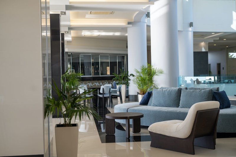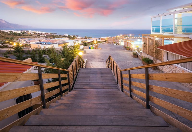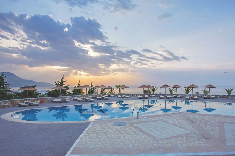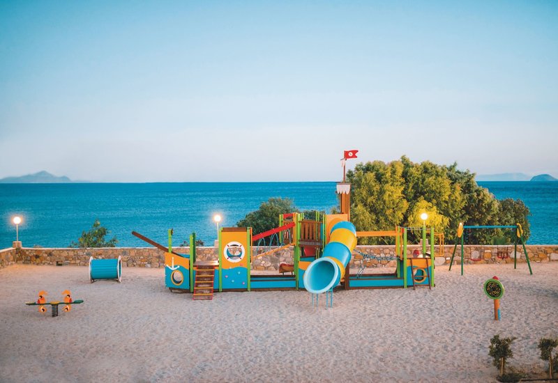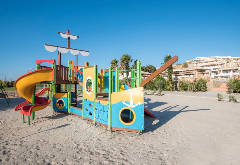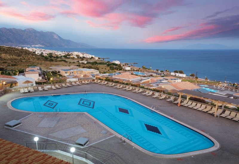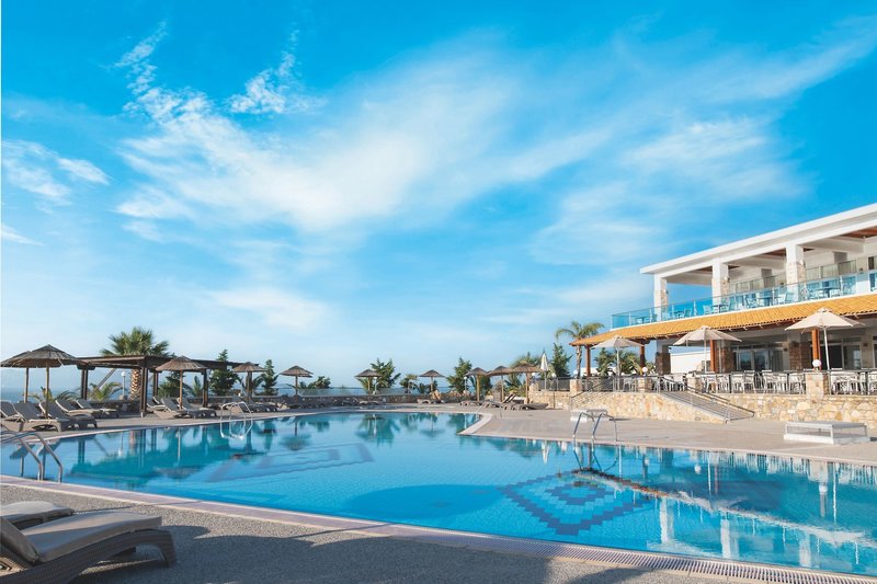 Ausstattung: Die weitläufige, familienfreundliche Anlage verfügt über 230 Zimmer im Bungalowstil und bietet eine 24-Stunden-Rezeption, eine zum Sommer 2025 renovierte Lobby, 3 Lifts, Internetecke, kostenfreies Wi-Fi in der gesamten Anlage, 2 Buffetrestaurants (griechisch und internationale Küche), 1 À-la-carte-Restaurant (Reservierung erforderlich), 4 Bars sowie einen Minimarkt.