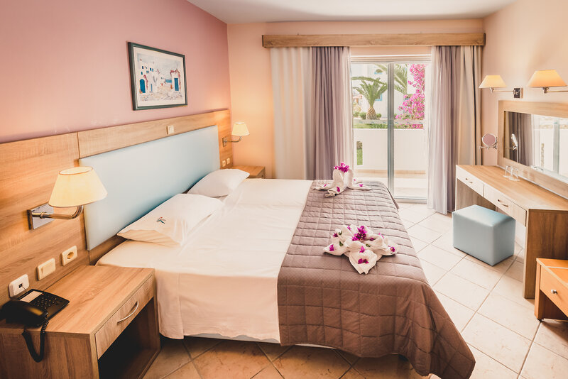 Die Standard-Zimmer verfügen über Bad oder Dusche/WC, Föhn, Klimaanlage, Telefon, Sat.-TV, WLAN, Minibar (ggf. gegen Gebühr) und Mini-Kühlschrank, Mietsafe und Balkon. Diese sind wahlweise auch mit Garten- oder Meerblick buchbar. Bei gleicher Ausstattung sind die Familienzimmer geräumiger und bieten wahlweise seitlichen Meer- oder Gartenblick.