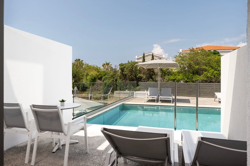 Junior suite swim up: Ugyanolyan felszereltséggel rendelkezik, mint a kétágyas szobák, plusz egy kis ülősarok, és közvetlen hozzáférést biztosít a közös medencéhez (SUJ).