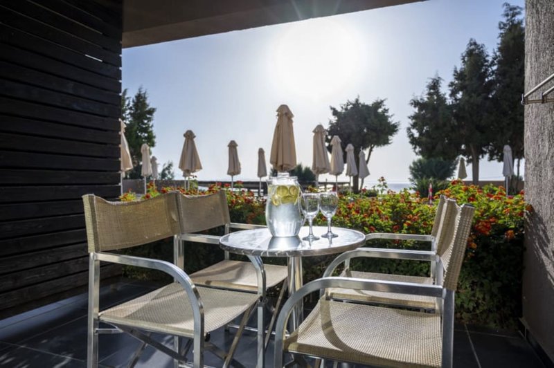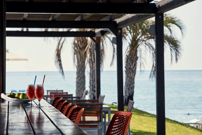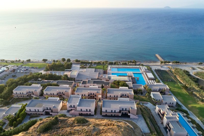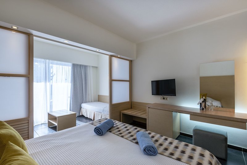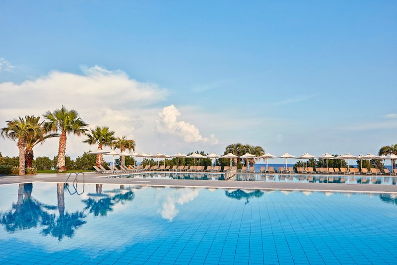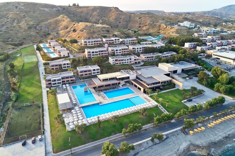 Ausstattung: Zur Ausstattung des Hotels zählen insgesamt 375 Zimmer, eine 24-Stunden-Rezeption mit Lobby, ein Minimarkt, sechs Außenpools, einen Kinderpool, einen Indoor Pool, eine Sonnenterrasse sowie kostenfreies Wi-Fi im gesamten Hotel. Ein Buffetrestaurant (italienisch), drei À-la-carte-Restaurants (griechisch, amerikanisch, asiatisch,einmal pro Woche inklusive) sowie zwei Bars gehören ebenso zu Ausstattung des Hotels. Sonnenliegen und Schirme am Strand und am Pool sowie Badehandtücher sind kostenfrei. Der Wasserpark kann kostenfrei genutzt werden.