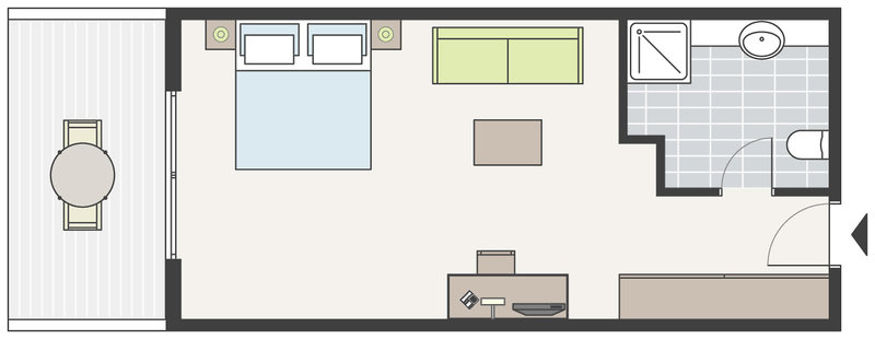 - Twin 4 (DZX2), Dreibettzimmer, im Hauptgebäude, Landblick, ca. 22 - 24 m², letzte Komplettrenovierung 2015, Gesamtanzahl der Räume in diesem Zimmertyp: 1, Aufteilung wie folgt: 1 Schlafzimmer, 2 Einzelbetten, 2 Schlafsofas (74x170cm), Klimaanlage: zentral gesteuert, Fußboden: Parkett, Safe: gegen Gebühr, Schreibtisch, Kühlschrank: ohne Gebühr, Kaffee-/Teezubereiter, Wasserkocher, Telefon, Internet: WLAN/WiFi: ohne Gebühr, Fernseher: Flatscreen, Sat-TV, Badewanne oder Dusche, WC, Föhn, Balkon oder Terrasse: mit Sitzgelegenheit