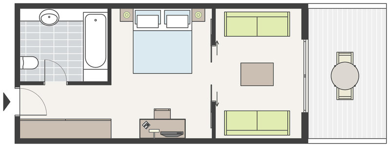 - Superior Family room (JSX1), Juniorsuite, im Hauptgebäude, Landblick, ca. 29 m², letzte Komplettrenovierung 2015, Gesamtanzahl der Räume in diesem Zimmertyp: 2, Aufteilung wie folgt: bestehend aus 2 Zimmern, optisch getrennt durch Schiebetür, 1 Doppelbett, 2 Schlafsofas (0,8x1,8cm), Babybett: ohne Gebühr, Klimaanlage: zentral gesteuert, Fußboden: Parkett, Safe: gegen Gebühr, Kühlschrank: ohne Gebühr, Kaffee-/Teezubereiter, Wasserkocher, Telefon, Internet: WLAN/WiFi: ohne Gebühr, Fernseher: Flatscreen, Sat-TV, Badewanne oder Dusche, WC, Föhn, Balkon oder Terrasse: mit Sitzgelegenheit