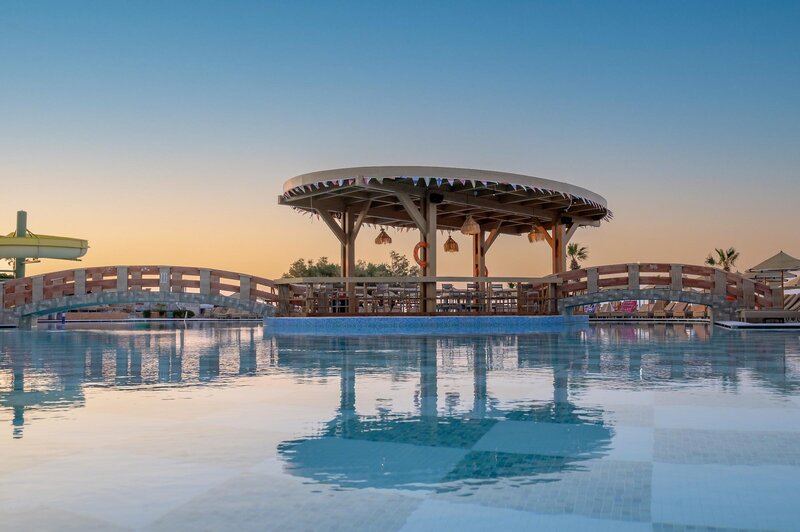 Das beliebte Hotel mit insgesamt 600 Zimmern bietet seinen Gästen eine Empfangshalle, WLAN (im öffentlichen Bereich kostenfrei) Internetecke (gegen Gebühr), ein Aufenthaltsraum, ein Restaurant, Bar und ein Minimarkt. In der Gartenanlage befinden sich zwei Meerwasser-Swimmingpools, ein Süßwasserswimmingpool, ein Wasserpark mit Rutschen, Sonnenterrasse mit Liegen und Sonnenschirmen und eine Poolbar. Liegen erhalten Sie am Strand gegen Gebühr.
