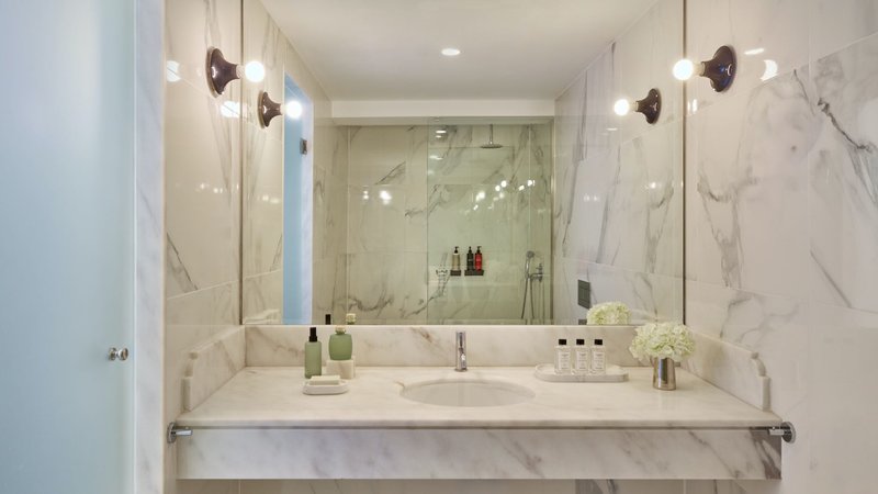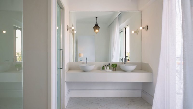 Familiensuite Deluxe: Die Familiensuiten bieten ein einzigartiges Gefühl von Luxus und Komfort. Der elegant eingerichtete Eingangsbereich führt zu einem großzügigen Ankleide- und Pflegebereich, sowie zu einem En-Suite-Marmorbadezimmer mit Waschbecken und Walk-in-Shower und separatem WC mit Waschbecken.