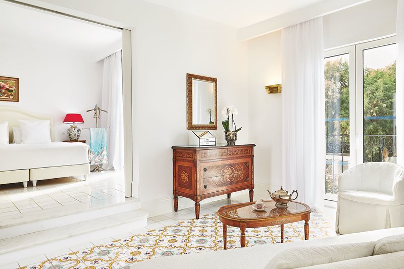 Juniorsuite Caramel: Die Juniorsuiten befinden sich im Hauptgebäude, bestehen aus einen kombinierten Wohn-/Schlafraum und verfügen über eine individuell regulierbare Klimaanlage, Fliesenboden, Safe, Espresso-Maschine, Kaffee-/Teestation, Minibar (gegen Gebühr), Telefon, LCD-Sat.-TV, Dusche/WC, Bademäntel und Slipper, Vergrößerungsspiegel, Personenwaage, luxuriöse Pflegeprodukte, Föhn sowie einen überdachten Balkon oder eine Terrasse (JS2) und wahlweise auch Meerblick (J2M/JMI).