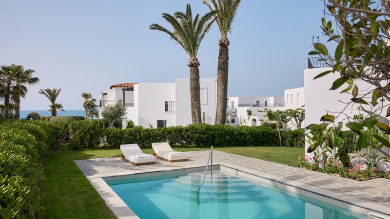 Beach Villa Seafront 2 Schlafzimmer: Die Villen erinnern an ein mediterranes Strandhaus mit großen Räumen, direktem Blick auf das Meer und feinem Design in Weiß & Elfenbein mit blauen Akzenten. Das Erdgeschoss verfügt über einen Eingangsbereich, der zu einem offen gestalteten Wohnraum und zu einer Schlafzimmer-Suite führt. Hier befindet sich ein Master-Schlafzimmer mit King-Size Bett und eine Lounge, die auch als Schlafplatz für ein Kind dient. Das große Spa-inspirierte Badezimmer verfügt über geräumige Schränke für zusätzlichen Komfort. Im Obergeschoss der Villa liegt eine zweite Master-Schlafzimmer-Suite mit direktem Blick auf das kretische Meer und ein stilvolles Badezimmer. Der große, voll möblierte Balkon und die geräumige Veranda machen das Entspannen unter freiem Himmel zum Genuss.