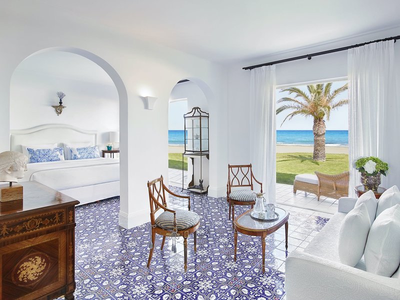 Deluxe Bungalow Suite: Die im Dorf-Stil erbauten Bungalow-Suiten befinden sich inmitten exotischer Palmen und üppigen kretischen Gärten. Bestehend aus einem Wohnbereich und einem separaten Schlafbereich mit Kingsize-Bett, verfügen diese über eine Klimaanlage (individuell regulierbar), Fliesenboden, Safe, Espresso-Maschine, Kaffee-/Teestation, Minibar (gegen Gebühr), Telefon, LCD-Sat.-TV, Dusche/WC, Föhn, Bademäntel und Slipper, Vergrößerungsspiegel, Personenwaage und luxuriöse Pflegeprodukte. Die private, voll möblierte Veranda oder Terrasse lädt zum romantischen Frühstück oder einem Getränk am Abend ein (LX2).
