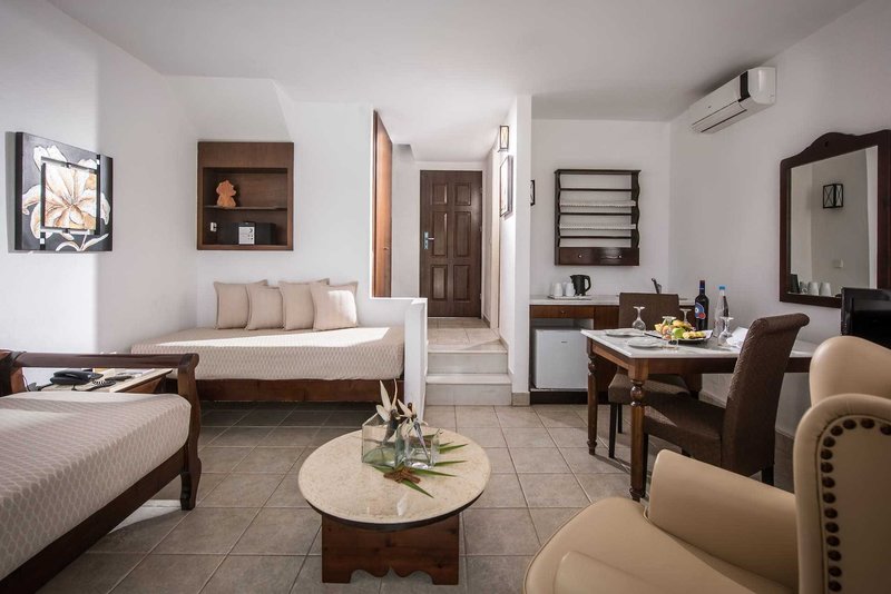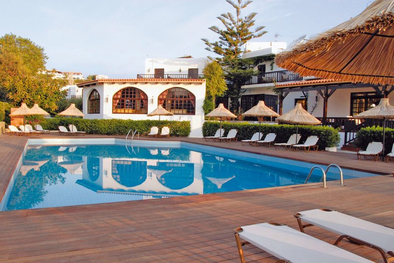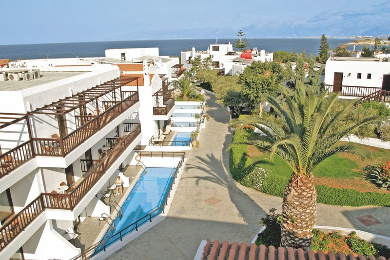 Ausstattung: Das im traditionell kretischen Architekturstil gehaltene Hotel verfügt über 204 Zimmer und bietet eine Rezeption, Aufenthaltsraum, Sat.-TV-Ecke, Internetecke, Wi-Fi in der Lobby (inklusive), Hauptbar mit Terrasse, Restaurant, Minimarkt und ein Hallenbad. Im Innenbereich befinden sich 2 Swimmingpools und ein Kinderpool sowie eine Beachbar, direkt am Meer gelegen. Sonnenschirme und Liegen stehen am Pool kostenfrei und am Strand gegen Gebühr zur Verfügung
