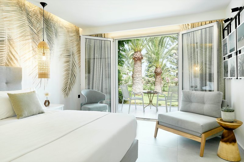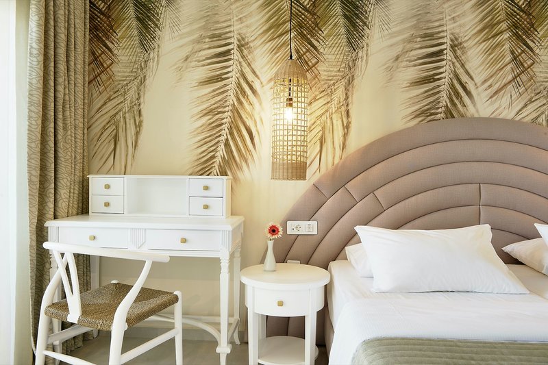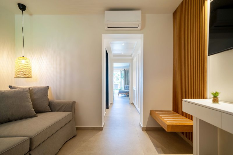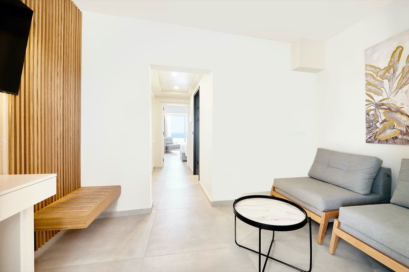 Familienzimmer: Die Familienzimmer liegen im Haupthaus und verfügen über einen Wohn-/Schlafbereich mit 2 Schlafsesseln sowie ein separates Schlafzimmer mit Twin-Betten, Dusche/WC, Föhn, Klimaanlage (warm/kalt), Safe, Sat.-TV mit Musikkanal, Wi-Fi (inklusive), Telefon, Kühlschrank, Minibar (gegen Gebühr), Wasserkocher sowie einen Balkon (DF2). Wahlweise auch als bereits zum Sommer 2023 renovierte Zimmer mit Meerblick (F2M) buchbar.