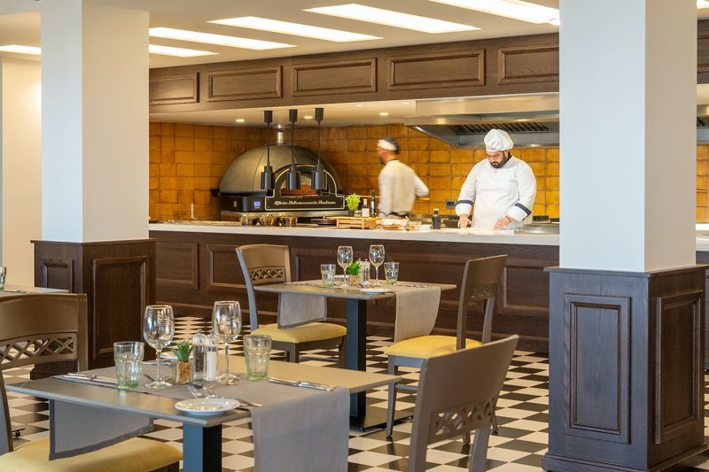 All Inclusive: Frühaufsteher-Frühstück (5-7 Uhr), Frühstück (7:30-10:15 Uhr), Mittag- (12:30-14:30 Uhr) und Abendessen (18:30-21:30 Uhr/Juni-September 19-22 Uhr) in Buffetform. 2x pro Woche ist das Abendessen in den À-la-carte-Restaurants inklusive (Reservierung erforderlich). Im italienischen Restaurant spätes Frühstück (10:30-11:30 Uhr, Reservierung erforderlich) und Mittagessen (12:30-15:30 Uhr) sowie Kaffee und Gebäck (16-17 Uhr). Snacks an der "Helios" Poolbar sowie der "Anatoli Ouzo Bar" von 10-18 Uhr (Mai-September, wetterabhängig). Ein Foodtruck mit griechischem Streetfood bietet wetterabhängig von Juni bis September Souvlaki, Gyros und ausgewählte Snacks an (10:30-18:30 Uhr). Lokale und internationale alkoholische und alkoholfreie Getränke sowie Long Drinks und Cocktails von 10-23:45 Uhr an den jeweils geöffneten Bars. Themenabende werden mehrmals wöchentlich angeboten.