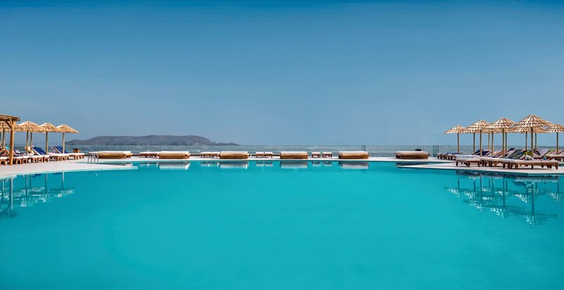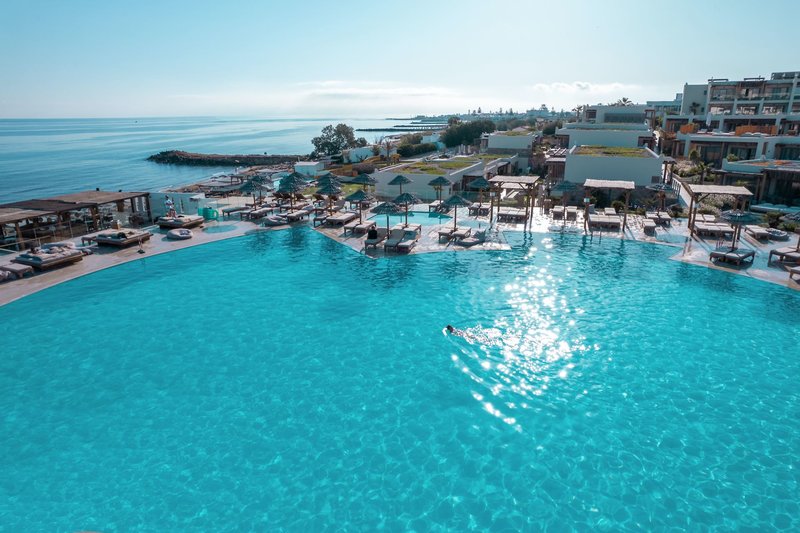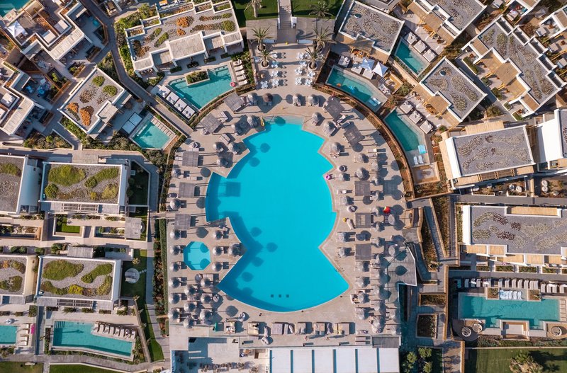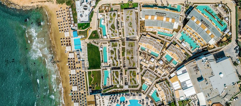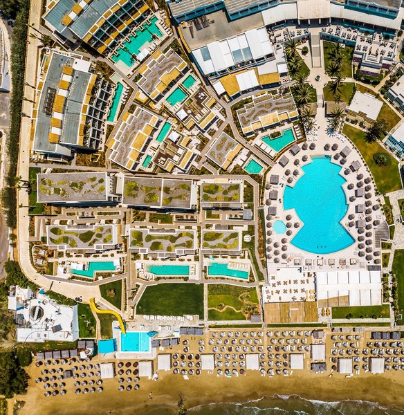 Ausstattung: Die im Bungalowstil erbaute, vielfach ausgezeichnete und weitläufige Hotelanlage mit 393 Zimmern, verteilt auf ein Haupthaus und mehrere Bungalowgebäude, verfügt über eine Empfangshalle mit Rezeption (24 h), Wi-Fi (in der Lobby und auf den Zimmern inklusive, Highspeed gegen Gebühr), ein Hauptrestaurant mit Show-Cooking und Themenabenden, eine Taverne (à la carte), ein Italian À-la-carte-Restaurant, Steak House À-la-carte-Restaurant, "Fine Italian" Pizza Station show cooking Kiosk, Beach BBQ Corner, Crêperie-Gelateria, "Fine Wine & Sushi" Bar sowie ein asiatisches Restaurant (Reservierung erforderlich), 6 Bars und das Café Rinela. Zur weiteren Ausstattung gehören eine kleine Shopping Arkade mit Friseur, Minimarkt, Boutique, Juwelier, eine Bibliothek, ein Open-Air-Theater (komplett renoviert), ein innen liegendes Theater und eine Disco. In der Gartenanlage befinden sich der Hauptswimmingpool mit kleinem Kinderpool, ein Kids-Pool mit 2 Wasserrutschen sowie ein Pool im Spa-Bereich, eine Sonnenterrasse mit herrlichem Blick auf die Ägäis sowie eine neu renovierte Taverne am Strand. Es gibt einen separaten Bereich am Strand, der nur für Erwachsene zugänglich ist. Liegen, Sonnenschirme und Badetücher sind am Pool und am Strand inklusive.