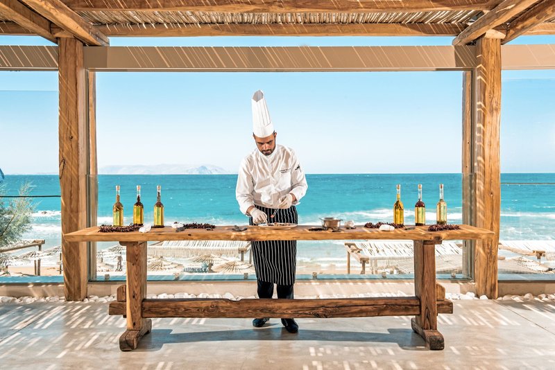 Ulltra All Inclusive: Frühaufsteher-Frühstück (4-7 Uhr), Frühstück (7-10:30 Uhr) Mittagessen (12:30-14:30 Uhr), Abendessen (18:30-21:30 Uhr) und "Late Buffet" (22:30-4 Uhr) mit kalten und warmen Snacks in Buffetform mit Show-Cooking. Zum Frühstück steht Ihnen eine Ecke mit griechischen Spezialitäten zur Verfügung. Lokale alkoholische, alkoholfreie Getränke sowie internationale Spirituosen sind von 9-2 Uhr an der jeweils geöffneten Bar erhältlich und inklusive. Das Mittagessen und Abendessen kann wahlweise in einem der À-la-carte-Restaurants eingenommen werden (einmal pro Woche je Restaurant nach vorheriger Reservierung und Verfügbarkeit). Griechisches À-la-carte-Restaurant: Mittagessen von 12:30-14:30 und Abendessen von 18:30-22 Uhr. Pan-Asian À-la-carte-Restaurant: Abendessen von 18:30-22 Uhr. Italienisches À-la-carte-Restaurant: Brunch von 9-12 Uhr und Abendessen von 18:30-22 Uhr. Steak House À-la-carte-Restaurant: Abendessen von 18:30-22 Uhr. Zudem sind von 8:30-10:30 Uhr warme Toasts, Hot Dogs, Hamburger und Crêpes mit Eiscreme erhältlich. Wechselnde Themenabende mit Show-Cooking im Hauptrestaurant (griechisch, italienisch, libanesisch, mexikanisch, mediterran, asiatisch, französisch), separate Station für italienische Pasta und Vegetarische Gerichte. Zusätzlich BBQ täglich 12-16 Uhr am Strand, frisch zubereitete Pizza 10:30-18 Uhr und eine Weinbar mit Sushi und Wein 18-1 Uhr (Nur für Erwachsene 18+ Jahre).