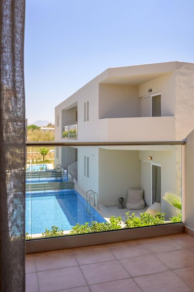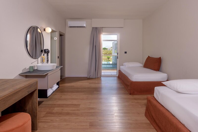 Die Standard-Zimmer verfügen über Dusche/WC, Föhn, Klimaanlage, Telefon, Sat.-TV, WLAN (kostenfrei), Minikühlschrank, Mietsafe (gegen Gebühr) und Balkon oder Terrasse. Diese sind auch als geräumigere Superior-Zimmer buchbar. Die Family-Suiten sind bei sonst gleicher Ausstattung wie die Standard-Zimmer geräumiger. Die Suiten mit privatem Pool entsprechen den Juniorsuiten und bieten einen Zugang zu einem privaten Swimmingpool. Die Suiten mit einem Schlafzimmer bieten bei gleicher Ausstattung wie die Standard-Zimmer einen separaten Schlafraum. Diese sind auch mit 2 separaten Schlafzimmern buchbar.