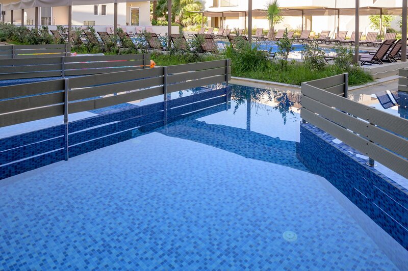Das Hotel verfügt über insgesamt 156 Zimmer, welche sich auf 6 Gebäude verteilen. Zu den Einrichtungen zählen ein Empfangsbereich mit Rezeption, WLAN (kostenfrei), 2 Lifte, Lounge, Hauptrestaurant, 4 Snack-Restaurants, Bars, Hallenbad und ein Konferenzraum. Im Außenbereich befinden sich 4 Swimmingpools mit Sonnenterrassen, Wasserrutschen und 2 Pool-/Snackbars (eine davon nur für Erwachsene). Liegen, Schirme und Badetücher erhalten Sie am Pool kostenfrei