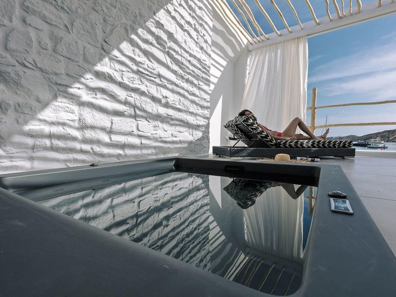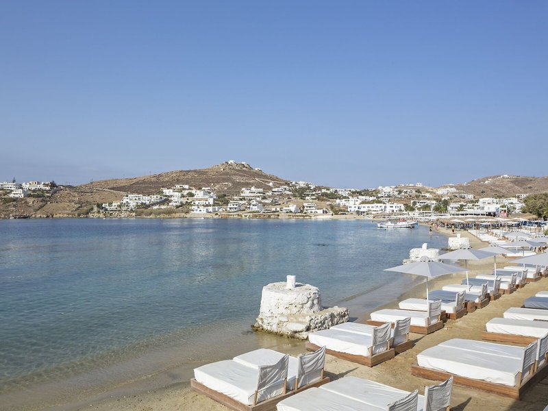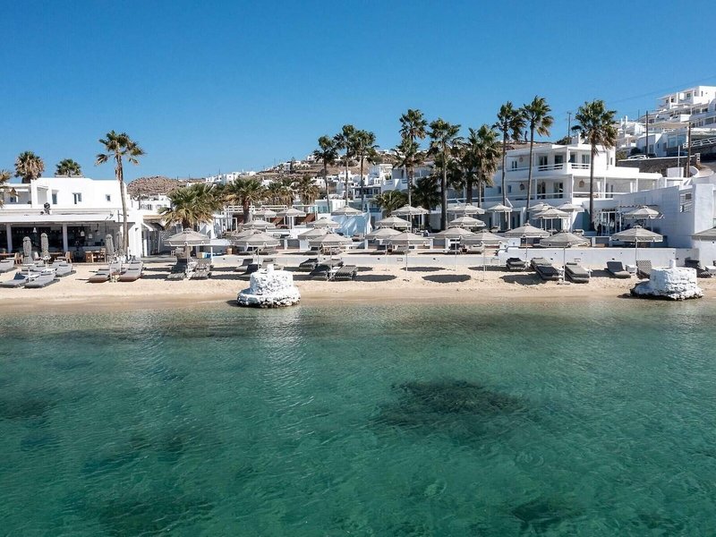 Lage & Umgebung Das Hotel erfreut sich bester Lage direkt am Sandstrand in Ornos Bay, nahe einiger Restaurants und Bars. Bushaltestellen sind schnell erreicht, von hier gelangen die Gäste bequem ins touristische Zentrum der ca. 3 km entfernten Stadt Mykonos. Der Flughafen Mykonos ist ungefähr 2 km entfernt.