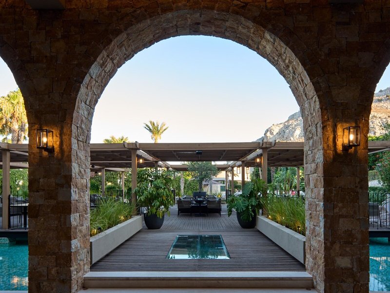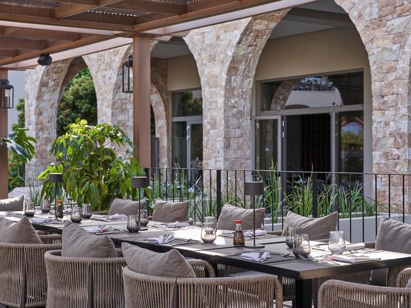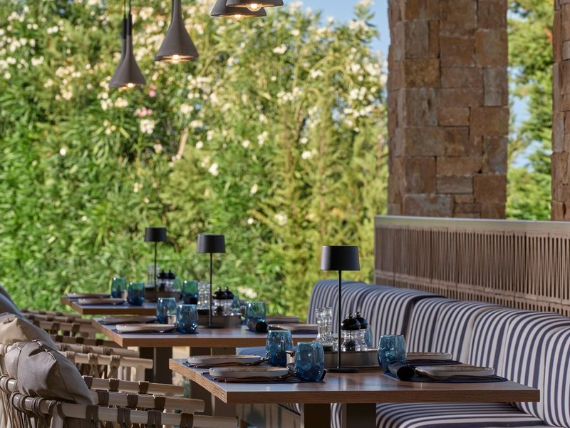 - Spezialitätenrestaurant „Istories Greek Cuisine à la carte“: Küche: griechisch, landestypisch, mediterran, regional, Fisch/Meeresfrüchte, Grillgerichte, à la carte, Reservierung notwendig, gegen Gebühr, mehrmals pro Woche 18:00 Uhr - 21:00 Uhr, mit Terrasse, am Pool, Kinderhochstuhl, angemessene Kleidung erwünscht