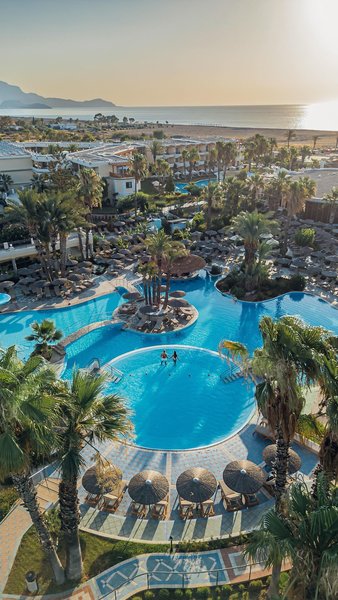 Ausstattung: Der atemberaubende Innenhof "Atrium", welcher durch einen attraktiven Wassergarten mit Seen und Wasserfällen, sowie einem gläsernen Panoramalift beeindruckt, gab dem Hotel seinen Namen. Das Hotel verfügt über 320 Zimmer (davon 19 Villen), eine großzügig gestaltete Empfangshalle mit Rezeption (24 h), Hauptbar "II Cavaliere", Strandbar, Hauptrestaurant "Symposium", 4 À-la-carte-Restaurants (asiatisches Fusion Restaurant "Zen", mediterranes Restaurant "Mesogeos", griechisches Gourmet Restaurant "Asterias", italienisches Restaurant "Il Gusto"), Minimarkt, Juwelier, Friseur, Bankautomat. Wi-Fi ist in der gesamten Hotelanlage inklusive. Durch seine Wasserfälle, Brücken, Teiche und Palmen bildet der große Poolkomplex mit 6 Frischwasser-Außenpools, eine Poolbar "Amphibia" und eine Strandbar "Kalathos" (11-18 Uhr) und kostenlosen Liegen, Sonnenschirmen und Badetüchern eine exotisch-tropische Atmosphäre. Liegen und Sonnenschirme sind am Strand ebenfalls kostenfrei verfügbar. Mit der Atrium Concierge App genießen die Gäste ein mühelosen Luxus und können Speisen und Getränke direkt zu Ihren Liegen am Strand oder am Pool bestellen (weitere Details siehe Hotelservice).